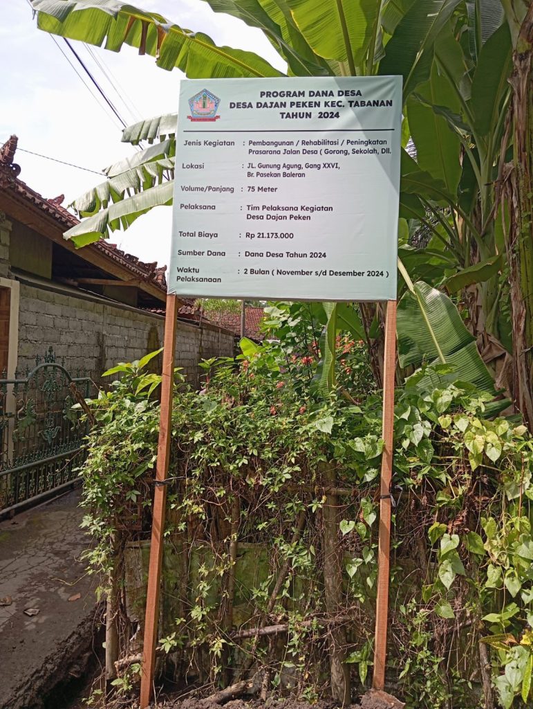 Giat Pembangunan/rehabilitasi/ peningkatan prasarana jalan desa berupa perbaikan drainase/selokan/gorong-gorong dilaksanakan di Jalan Gunung Agung Gang XXVI, Br Dinas Pasekan Baleran, Desa Dajan Peken. Program ini sudah tercover dalam APBDes Pemerintah Desa Dajan Peken tahun anggaran 2024 atas usulan masyarakat Banjar Dinas Pasekan Baleran. Adapun nilai proyek yakni Rp. 21.173.000 yang bersumber dari Dana Desa Tahun 2024.