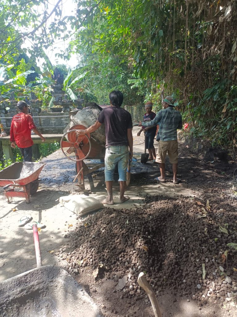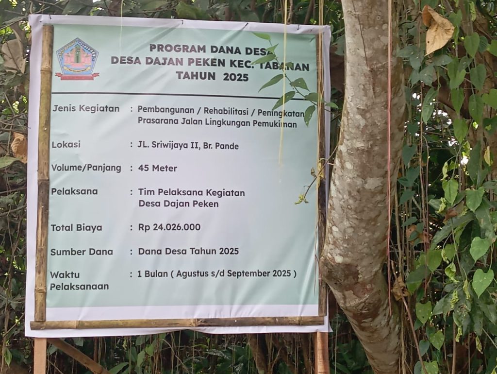 Giat Pembangunan/rehabilitasi/ peningkatan prasarana jalan desa dilaksanakan di Jalan Sriwijaya II Banjar Pande, Desa Dajan Peken. Adapun kegiatan rehabilitasi jalan yakni berupa rabat beton. Program ini sudah tercover dalam APBDes Pemerintah Desa Dajan Peken tahun anggaran 2025 atas usulan masyarakat Banjar Dinas Pande. Adapun nilai proyek yakni Rp. 24.026.000 yang bersumber dari Dana Desa Tahun 2025.